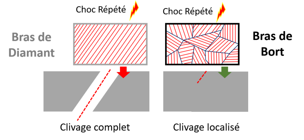 Dans le cas de Diamant il suffit de lui infliger des chocs répétés pour propager une fissure à travers l’intégralité de son bras et ainsi provoquer son clivage en deux parties bien planes. On voit d’ailleurs ceci se produire avec d’autres personnages au cours de la série comme Phos. Dans le cas de Bort par contre, la fissure créée va suivre le plan de propagation du grain impacté mais va se voir stoppée par le grain ou le défaut suivant pour qui cette direction ne va pas être un point faible. Bort va ainsi pouvoir encaisser un nombre de microfissures très important avant de voir son intégrité physique menacée.