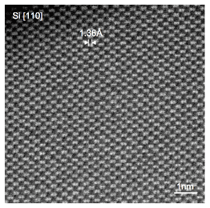 Microscopie électronique à transmission sur une surface plane de Silicium / Microscopie ionique sur une surface sphérique d’or (chaque point est un atome du cristal)