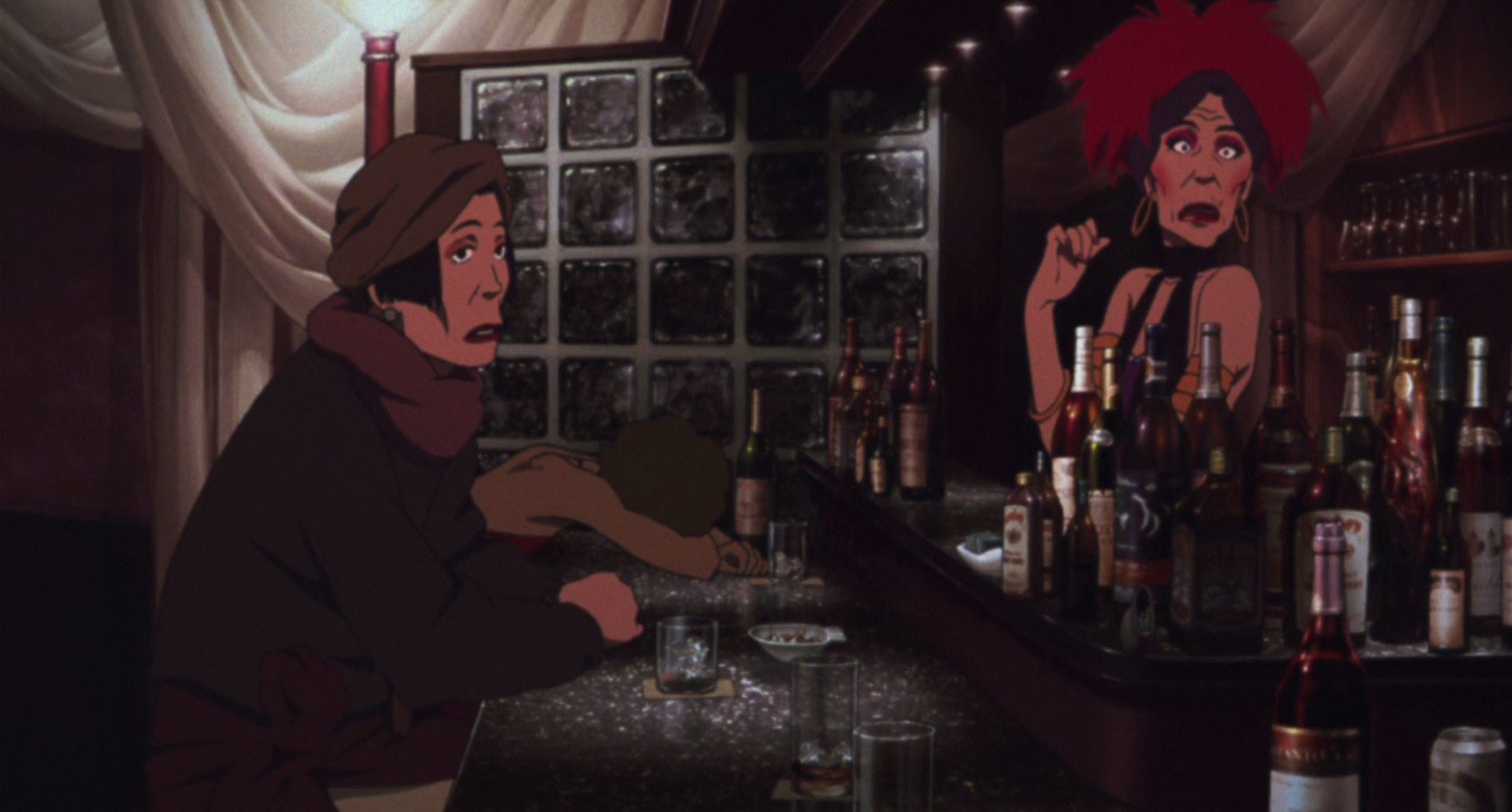 Cet attrait des personnages on ne le doit pas qu’à une écriture bien réussie mais aussi grâce au chara-design de Satoshi Kon (oui toujours le même) qui en étant aussi réaliste que sur ses autres films, crée un décalage formidable sur Tokyo Godfathers lorsque les émotions viennent littéralement défigurer les personnages. Hana et Gin sont sans doute les meilleurs exemples, de sorte que la première est ultra-expressive, une véritable montagne russe à émotions qui le montre aussi bien par des expressions farfelues qu’une gestuelle improbable ; Gin quant à lui a ce visage de celui qui ne comprend pas dans quel pétrin il est embarqué.