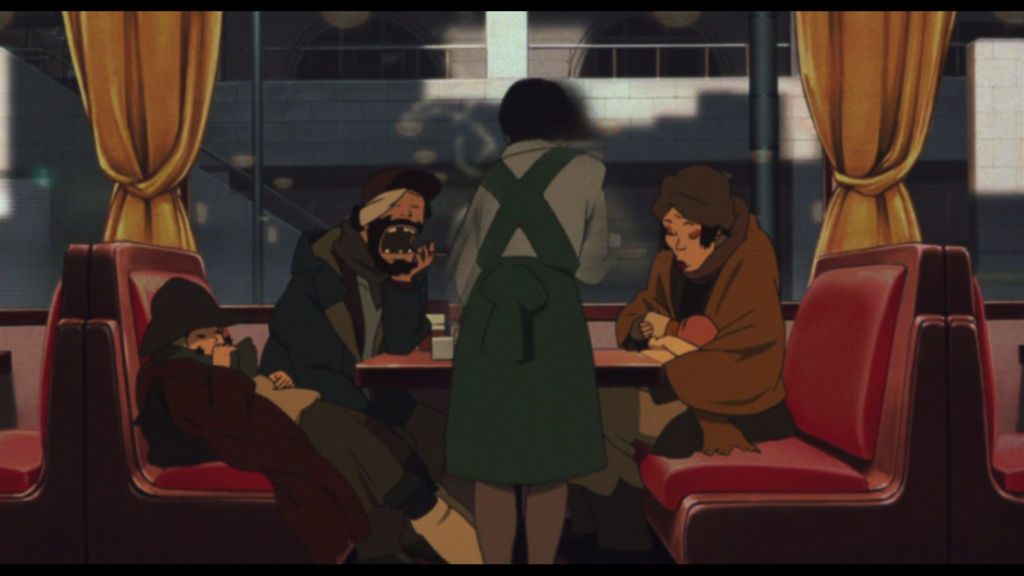 Il n’y a ici pas de place pour un Père Noël, ou de la charité désintéressée. Tokyo Godfathers ne nous offre pas pour autant une vision acerbe ou critique de la société mais se contente de faire figurer pendant plus d’1h30 une foule d’individus rarement mis en avant à l’écran et plus rarement encore de cette manière. Comme des gens avec des tracas qui n’appartiennent à personne d’autre, que l’on soit une fugueuse, un mafieux dans une situation délicate, une infirmière sans père ou le gérant d’un konbini occupé à dégager des sans-abris.