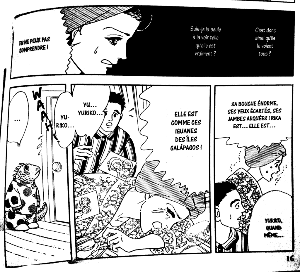 Et avec un peu de recul l’histoire de Rika n’est pas si extravagante. Ses tracas, ses soucis et cette relation compliquée ne sont pas étrangers à ceux d’une jeune fille normal. En représentant la fille comme une iguane tout en sachant que seule sa mère la voit ainsi, Moto Hagio ne fait qu’accentuer ce sentiment étrange que pourrait ressentir n’importe quelle personne durant sa jeunesse quand il s’agit de chercher à se faire accepter auprès des autres, de supporter son regard dans le miroir et tout simplement de grandir.