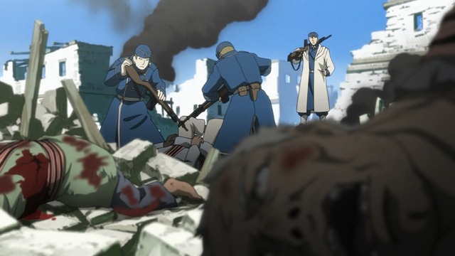 Tout le long on nous parle des alchimistes comme étant des armes humaines, la venue d’une guerre comme celle d’Ishval était donc évidente. Quand celle-ci arrive enfin, Arakawa est loin de la mettre en avant. La confrontation entre les troupes de centrale et celles de Briggs et d’East city est trop gentillette et ne s’offre pas les allures d’une vraie guerre ce qui est diablement frustrant.