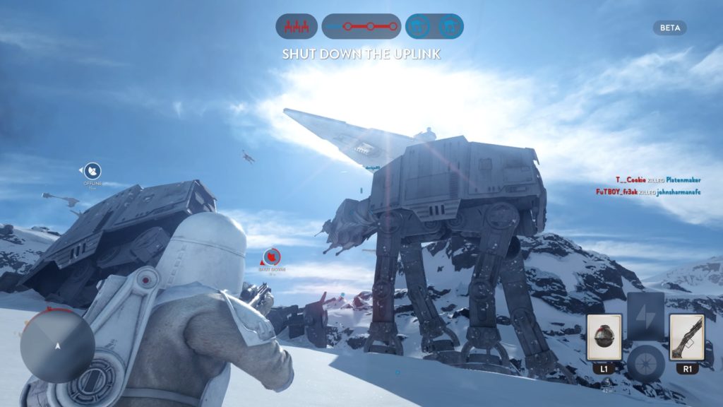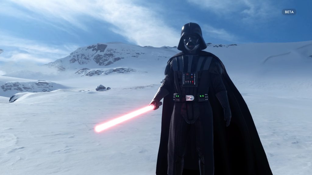 Ce qui frappe lorsque l’on lance la bêta pour la première fois et que l’on pose les pieds sur Hoth c’est certainement la beauté glaciale de l’environnement. Mais pas le temps d’être charmé par les effets de la neige qui viennent délicatement se poser sur le canon de votre blaster puisque des X-wing affrontent les chasseurs TIE impériaux juste au-dessus de vous, vous pouvez d’ailleurs entendre le bruit si significatif de leur canon et bientôt une explosion.