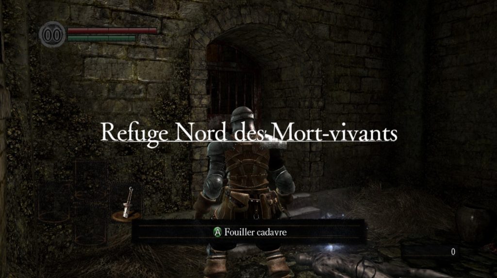 Après un menu de création de personnage (classique, un choix de classe avec un équipement et des statistiques uniques, ainsi qu’une customisation d’apparence plutôt incomplète) et une cinématique expliquant les bases de l’univers du jeu, vous retrouvez votre personnage sous forme de carcasse, seul dans une cellule d’une prison délabrée, quand un cadavre affublé d’une lueur blanche tombe sur le sol, lâché par un étrange chevalier. Votre avatar se lève, équipé seulement d’une épée brisée, « Asile des Morts-Vivants » s’affiche en grosses lettres blanches : ainsi commence le tutoriel de Dark Souls.