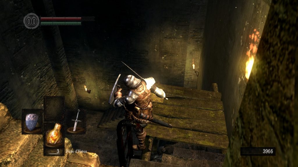 La disposition des checkpoints joue également un très grand rôle dans l’expérience Dark Souls, le jeu étant plutôt avare en feux de camp (et ne les indiquant pas au joueur), il n’est pas rare de passer de longs moments sans croiser le moindre point de contrôle. En plus d’ajouter un élément de tension au tout, cela transforme la découverte d’un nouveau feu de camp, ou d’un raccourci y menant en un grand soulagement.