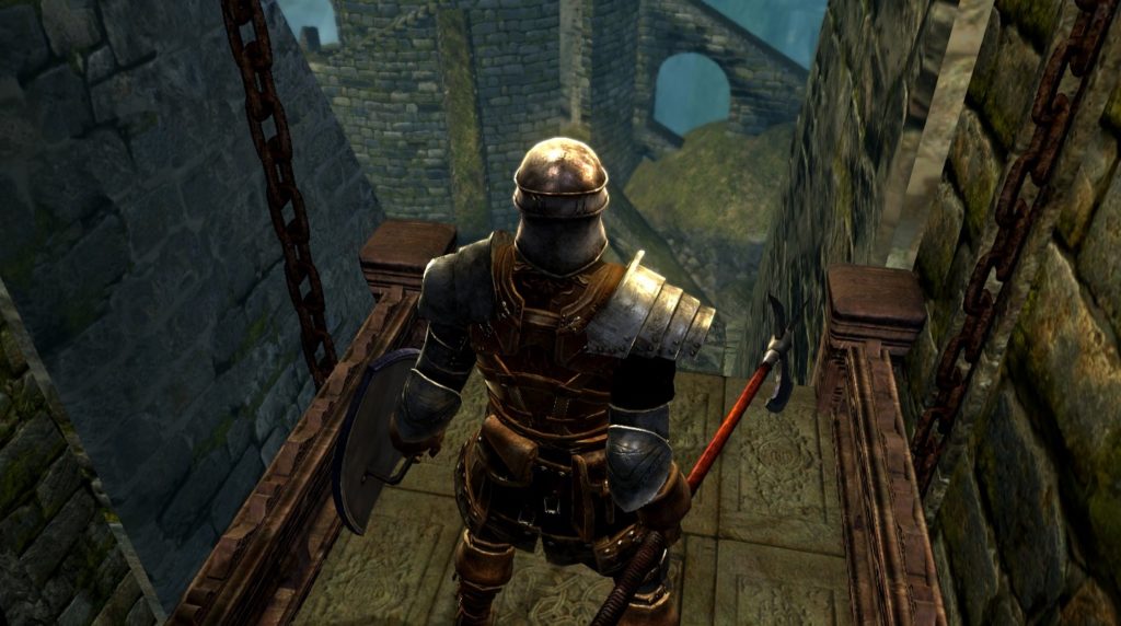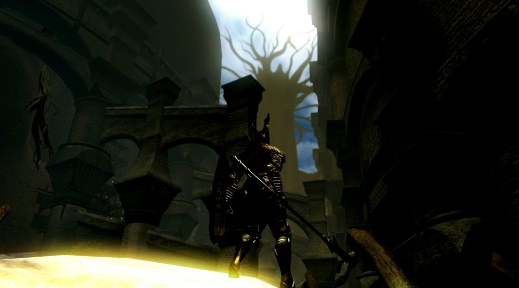 Lordran n’est pas une suite linéaire de niveaux, et cela n’est pas simplement dû au hasard : il n’y a pas de voyage rapide au début du jeu. Il s’agit du seul jeu de la série qui le fait et c’est cette décision qui rend Dark Souls premier du nom si unique, même vis-à-vis des autres jeux de la franchise. Cela implique bien évidemment de pouvoir faire se déplacer relativement rapidement entre différentes extrémités afin d’éviter de rendre la navigation pénible et ennuyeuse, pour ce faire il faut considérer la façon de construire le monde autrement et le world design de ce jeu constitue un point majeur de son expérience, le monde est une sorte d’immense et large tour truffée d’ascenseurs et de raccourcis, à un tel point où le sanctuaire de lige-feu, sorte de hub central du monde, mène à 6 zones différentes. Cela immerge et investit efficacement le joueur dans le monde, l’encourage à retenir ces passages, à prêter attention à l’architecture, de s’aventurer dans chaque recoin à la recherche de raccourcis ou de niveaux cachés, en plus des trésors traditionnels au genre. Certains des plus grands moments du jeu sont dus à ce world design.